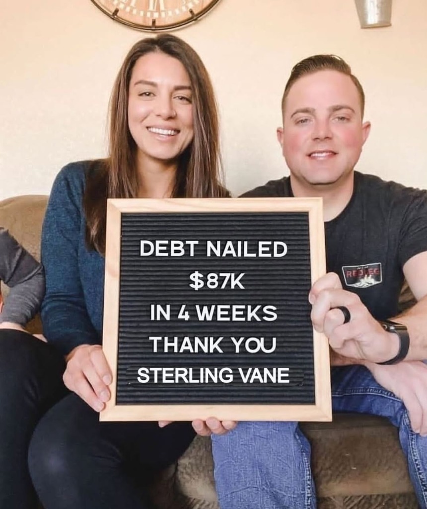 $87K"Debt nailed — $87K cleared in 4 weeks. Thank you Sterling Vane. This has been life-changing for our family."