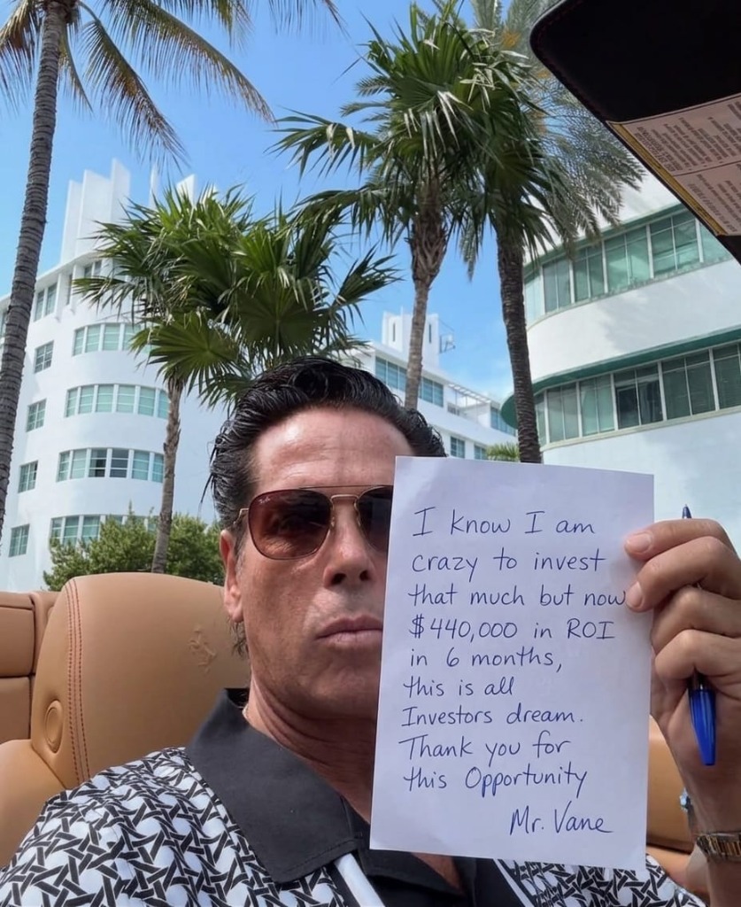 $440K ROI"I know I am crazy to invest that much but now $440,000 in ROI in 6 months — this is every investor's dream. Thank you for this opportunity Mr. Vane."